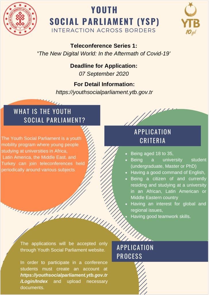O Parlamento Social da Juventude (PSJ) é uma plataforma de mobilidade juvenil online conduzida pelo Presidente para os Turcos no Exterior e Comunidades Relacionadas (YTB). O PSJ oferece aos jovens que estudam em universidades na África, América Latina, Oriente Médio e Turquia um conteúdo em que eles podem participar de teleconferências realizadas periodicamente sobre assuntos específicos, sugerir novos assuntos para teleconferências relacionados aos seus interesses, votar nos assuntos existentes e experimentar interação social com seus pares de diferentes continentes por meio de teleconferências.